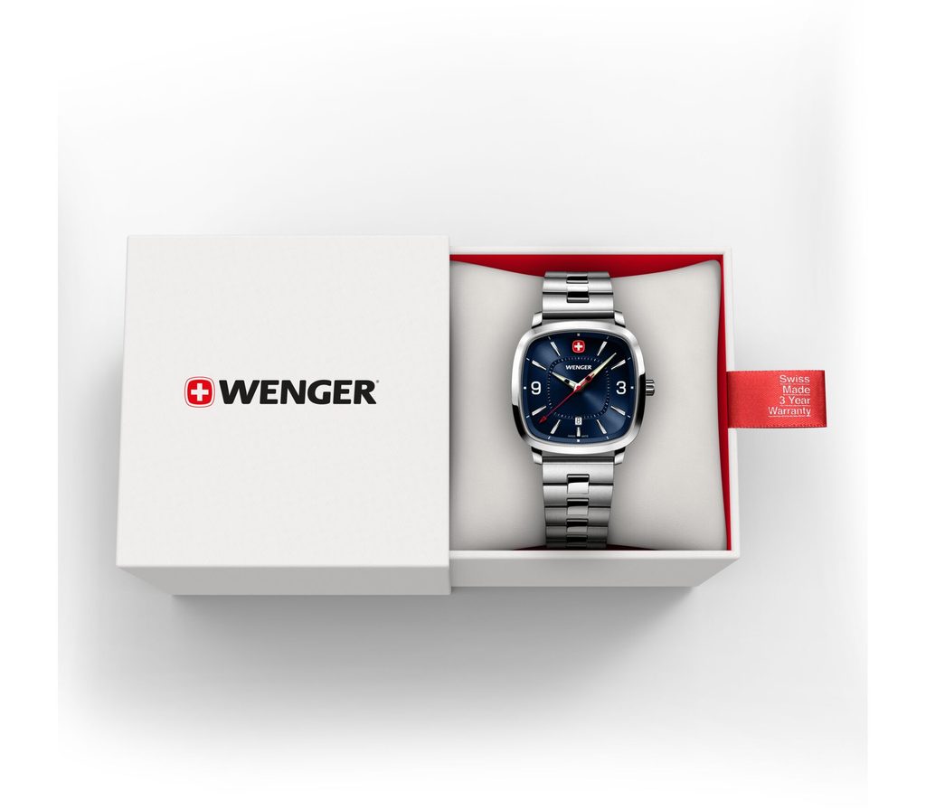The newly introduced Vintage Sport range features an innovative square-shaped case that uses the same shape as the Wenger logo itself. It features a classic dial with silver indices, and a date window at 6 o'clock.