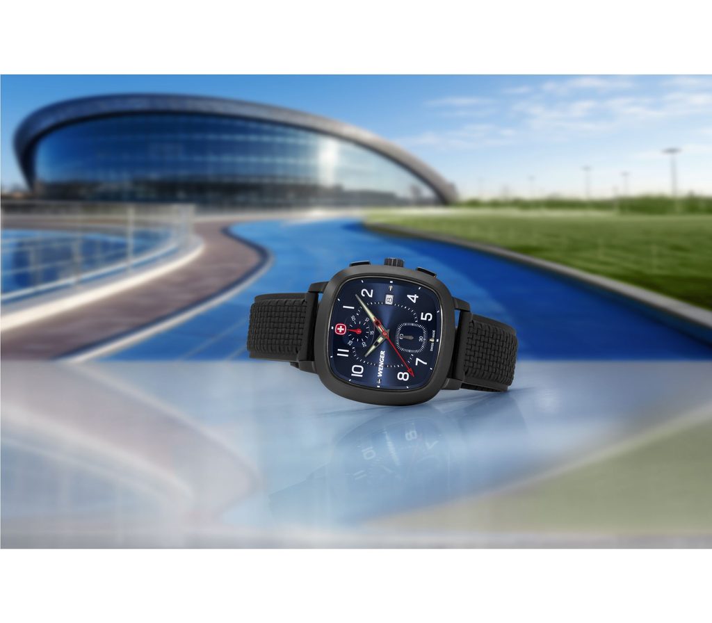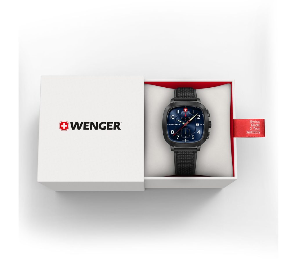 The newly introduced Vintage Sport range features an innovative square-shaped case with a black PVD finish, which uses the same shape as the Wenger logo itself. Featuring a classic dial with white indices, and a date window at 3 o'clock.